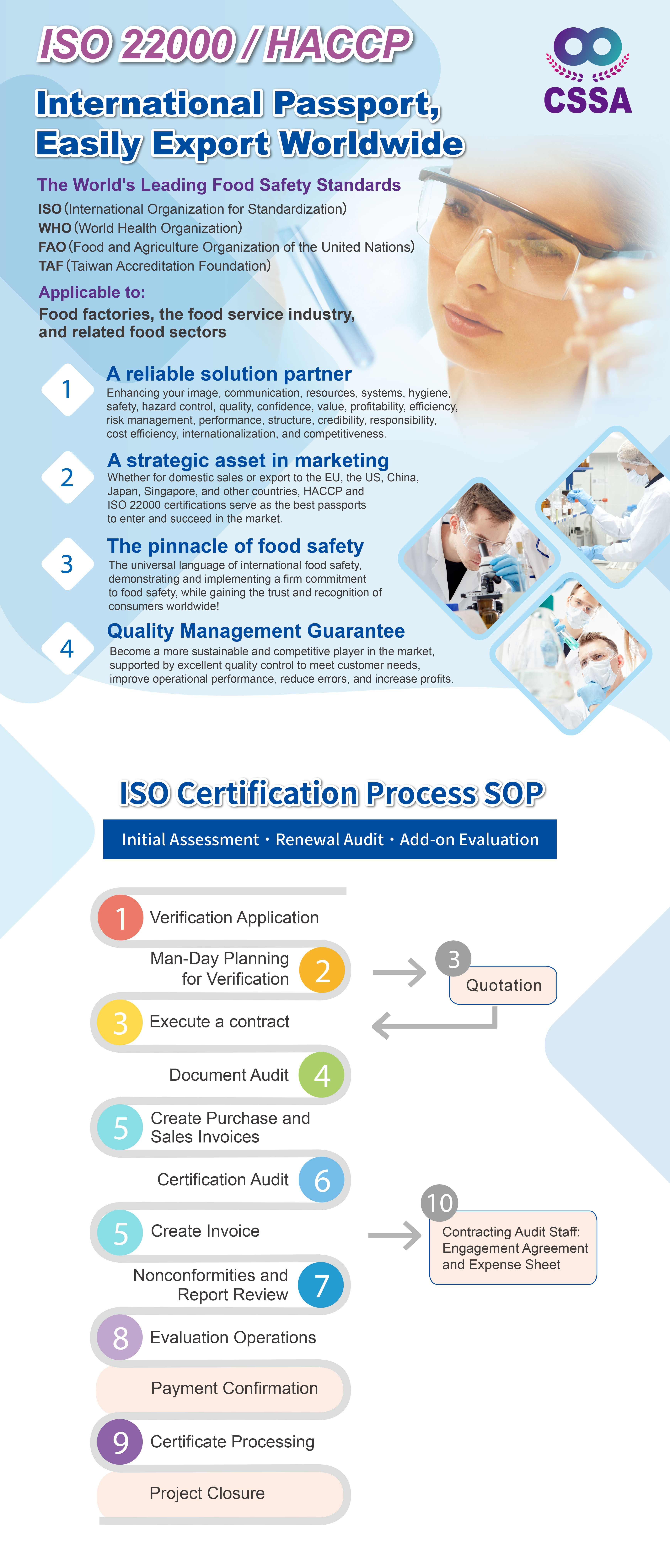 In the 2018 revision, organizations are required to analyze the results of Clauses 4.1 (Context of the organization), 4.2 (Interested parties), and Clause 6 (Planning). Based on these results, the FSMS must be appropriately maintained and updated, with relevant changes incorporated into management review. For organizations that have implemented ISO 9001:2015, the change management process can generally be integrated. However, attention must be paid to the fact that ISO 22000 focuses specifically on FSMS-related changes. 3. ISO 22000:2018 – Strengthened Leadership Responsibilities 3-1. Top management must demonstrate commitment to the FSMS. 3-2. Ensure alignment between food safety objectives and the organization’s strategic direction, provide resources for FSMS operation, and ensure staff understand their responsibilities. The revised ISO 22000 emphasizes the role of top management in ensuring the successful implementation and continuous improvement of the FSMS through active involvement. 4. ISO 22000:2018 – Provision of Resources and Work Environment 4-1. Organizations must assess the capabilities and limitations of internal resources to effectively establish, update, and maintain the FSMS. 4-2. Requirements have been expanded to include resources related to the work environment, including hardware, software, occupational safety factors, ergonomics, and employee health. 4-3. PRPs (Prerequisite Programs) now include requirements for supplier evaluation, product information, consumer awareness, and applicability of the ISO/TS 22002 series. 5. ISO 22000:2018 – Competence and Communication 5-1. Additional requirements have been added regarding the scope of both internal and external communication. 5-2. External communication has been strengthened. Organizations must identify responsible parties and establish mechanisms for gathering information, which must be included as inputs for management review. 6. ISO 22000:2018 – Considerations for External Providers 6-1. Additional requirements have been introduced for external providers. 6-2. Organizations must establish criteria for the evaluation, selection, monitoring, and re-evaluation of external suppliers, as well as ensure effective communication. Supplier performance must be considered during management review. For outsourced R&D, organizations must ensure that the information complies with the updated requirements, is reviewed by the food safety team, is applicable to existing facilities, processes, and products, is appropriately maintained and updated, and is supported by documented evidence. 7. ISO 22000:2018 – Product Information and Emergency Preparedness 7-1. Enhanced traceability system requirements; organizations must verify and test the effectiveness of their traceability systems. 7-2. Increased emphasis on raw material origins. 7-3. Final product characteristics now include transportation, storage, and usage methods. 7-4. Strengthened emergency preparedness requirements, including types of emergencies, legal requirements, communication, and response actions. While traceability requirements may not pose a significant challenge under current national regulations, the revised standard outlines specific types of emergencies and requires documented procedures and records for both actual incidents and simulations. 8. ISO 22000:2018 – Process and Operational Control 8-1. Enhanced process and environmental control with on-site verification requirements. 8-2. Expanded guidance on HACCP, including defining monitoring limits and validating control measures. 8-3. New terminology introduced: single control measures and combinations of control measures, with emphasis on validation. 8-4. Software used for monitoring and measurement must be verified—either by the organization, the software provider, or a third party—before use. 8-5. New requirements for validation plans. 9. ISO 22000:2018 – Nonconformity and Corrective Actions 9-1. New sources of corrective actions added, including inspection reports and customer complaints. 9-2. Stricter controls on nonconforming products: Products that exceed CCP (Critical Control Point) limits must not be released without proper evaluation. 9-3. Corrective actions must consider the possibility of recurrence or similar nonconformities. 10. ISO 22000:2018 – Internal Audit and Management Review 10-1. Internal audits now include additional elements to verify whether the FSMS aligns with food safety policy and meets the organization’s FSMS objectives. 10-2. Changes to the inputs required for management reviews.