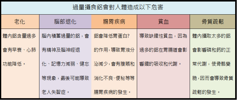 攝食過量鋁會造成老化、貧血、腦部退化等危害。(圖/社團法人中華食品安全協會提供)