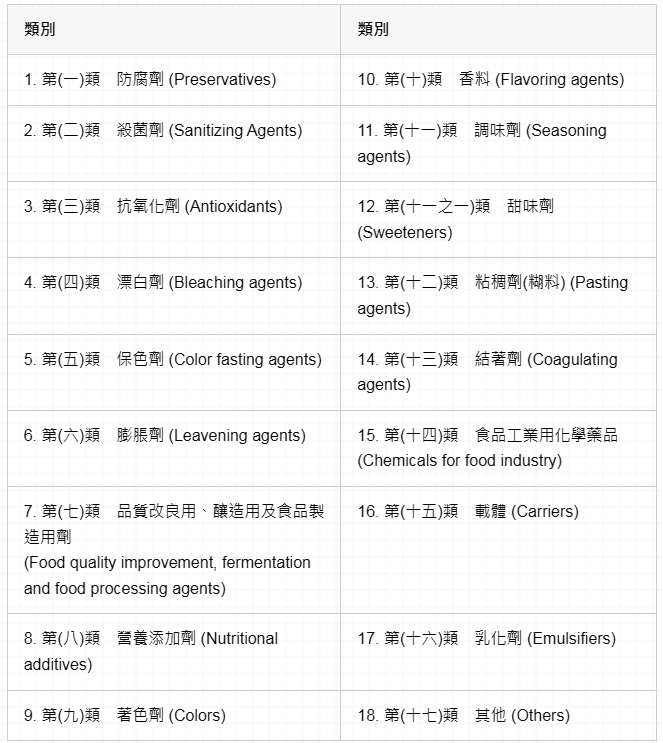 從人類歷史來看,食品添加物並非現代才有。最初的食品添加物,像是香料、鹽巴等,就是用添加物以達到調味、幫助保存的功用。隨著現代科技進步,人們利用化學合成的方法,得以取得許多天然食物中不存在的化學物質作為添加物,來達到一些在食品製程上的特定目的。現行的食品添加物共有十七大類,分類和功能如下表所示: