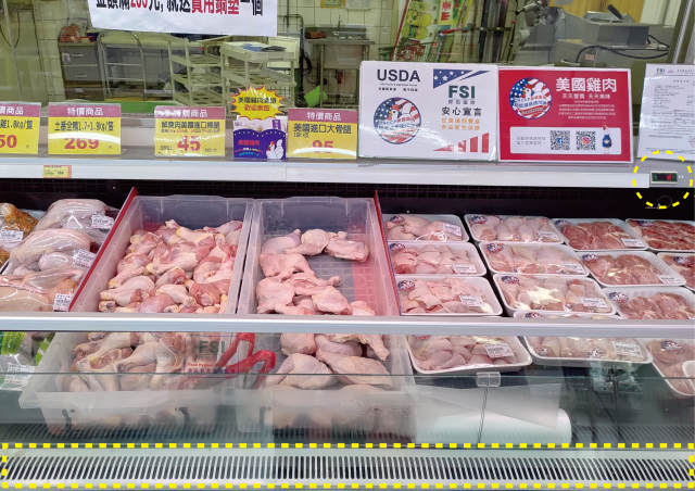 本圖中,有3種不同包裝的雞肉,最左邊是國產的土雞真空包裝,表變顏色較紫,這是還原體狀態的雞肉肉色。中間是散裝的美國雞腿,右邊是保鮮膜包裝的美國雞腿,相片中的美國雞腿都是冷凍進口來臺的,賣場也在陳列櫃上標示「冷凍肉解凍」,解凍美國雞腿的肉色顏色粉紅,骨髓呈鮮紅色,仍維持良好的鮮度。如果看到肉色偏褐,甚至骨髓變褐變黑,那就意味著陳列太舊或溫度控制不佳,鮮度不佳。