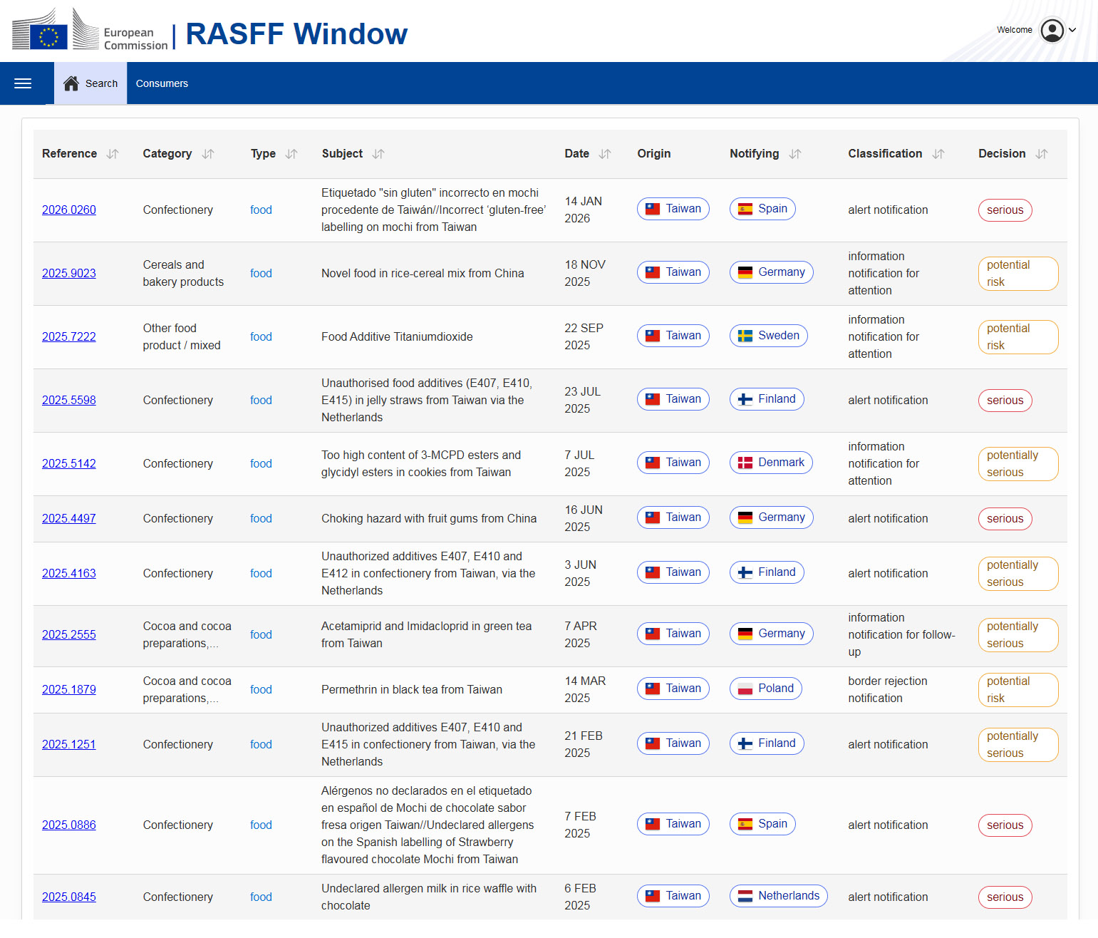 2025/1-2026/1 歐洲RASFF 不合格通報